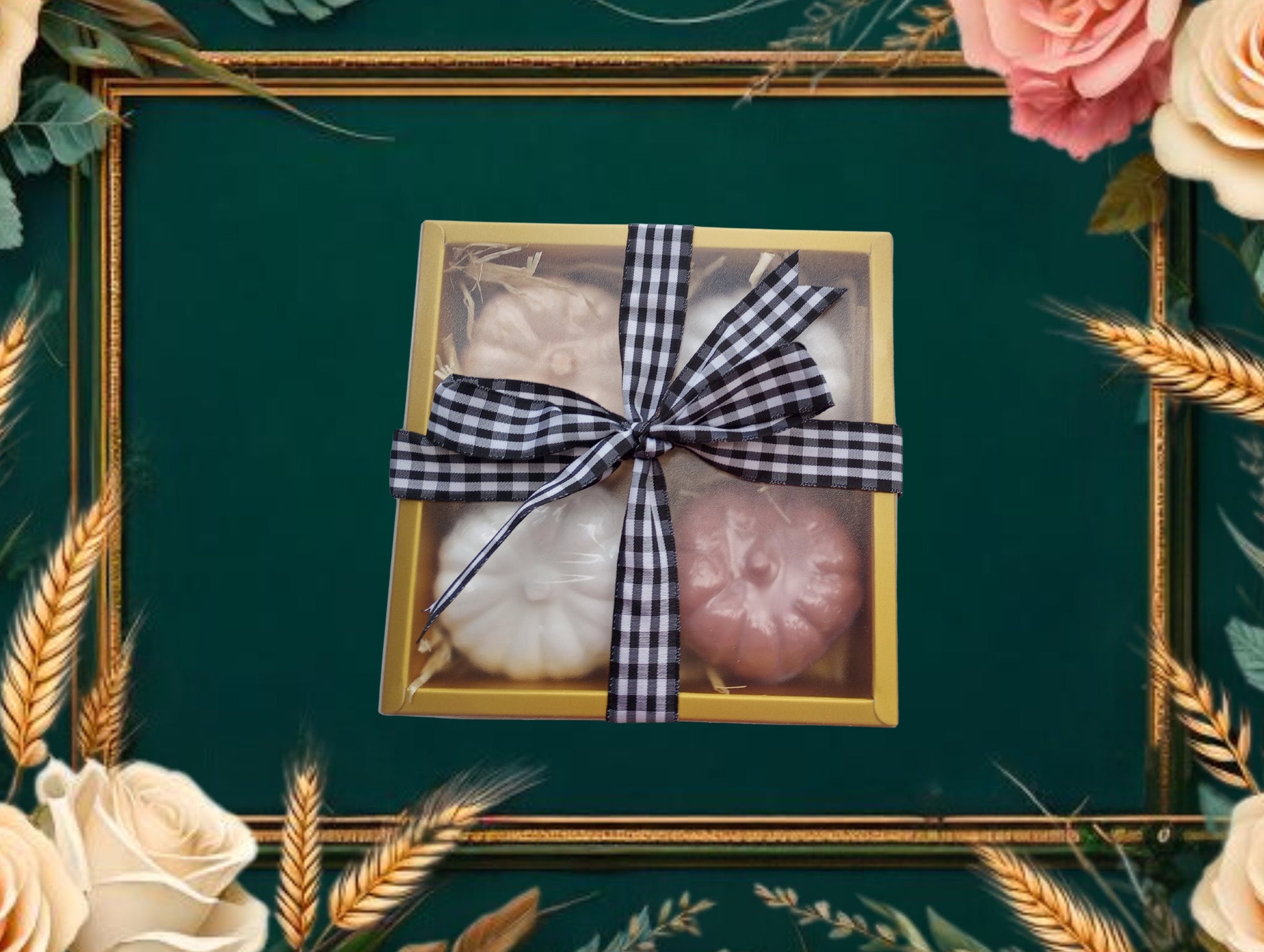 Get ready to fall in love with this whimsical pumpkin soap gift set! Beautifully packaged in a gold box with festive ribbon and cozy straw filler, this set delivers four generously sized pumpkin soaps (4.5oz each)—the largest you'll find anywhere.